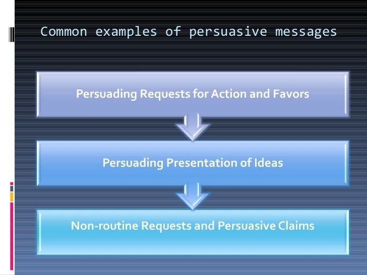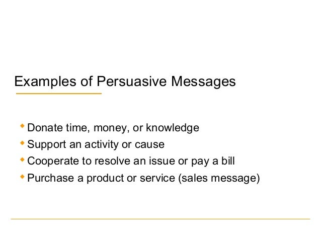 Persuasive Message Examples. A persuasive message is the central message that intrigues, informs, convinces, or calls to action. I used these two examples in class for students to compare.