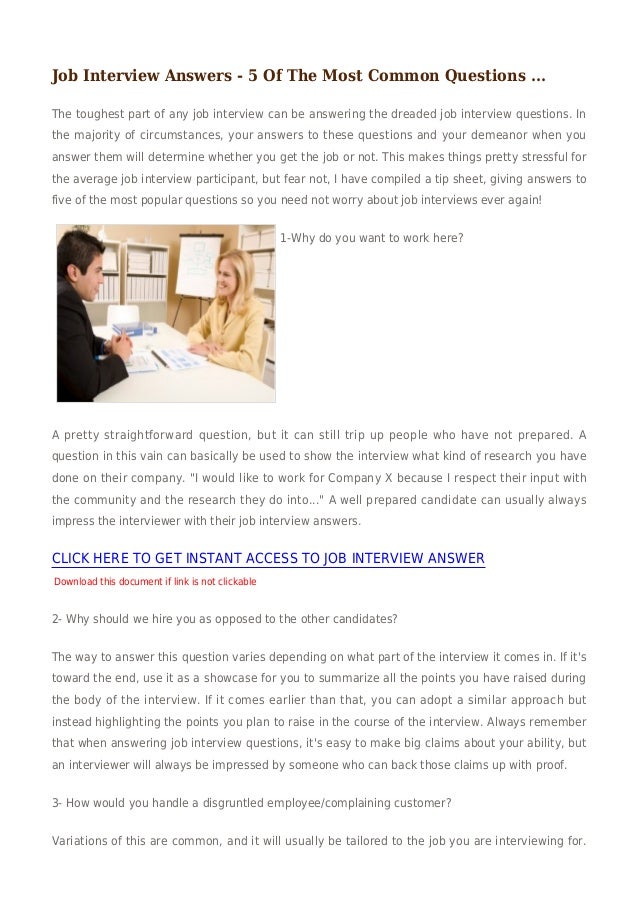 Job Interview Answer. Prepare for common job interview questions at every difficulty level. While some job interviewers take a fairly unusual approach to interview questions, most job interviews involve an exchange of common interview questions and answers (including some of the.